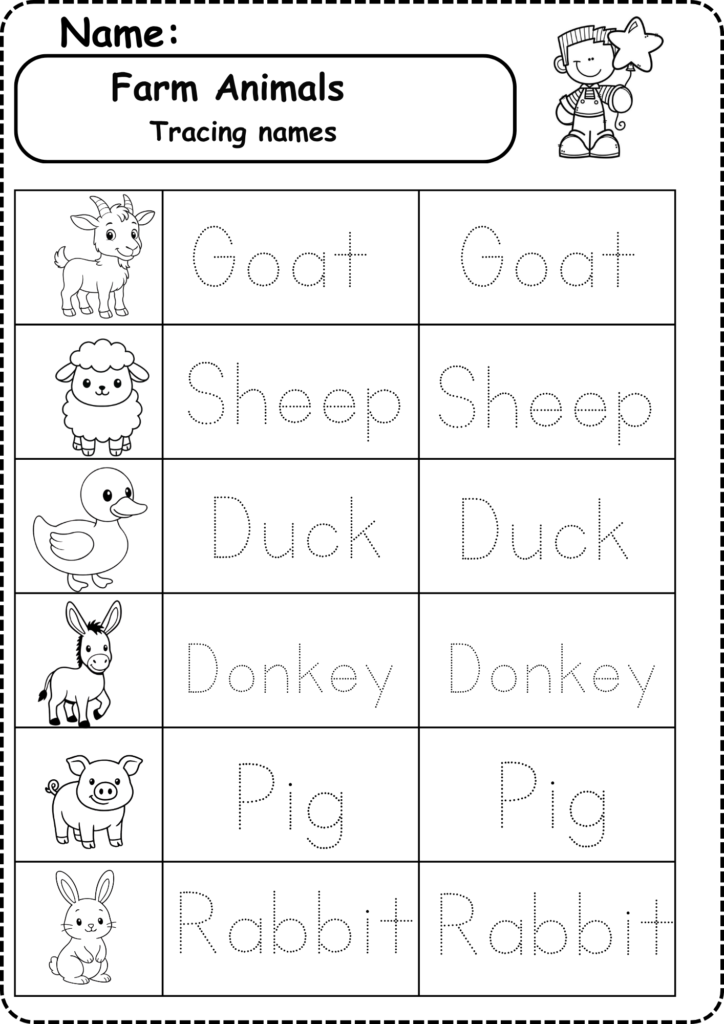 Kids trace the names of farm animals. This helps them learn how to write and improves handwriting.