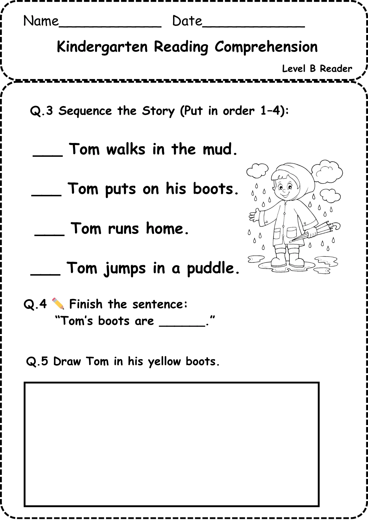 Title: Free Reading Comprehension Kindergarten Level B – Tom’s New Boots