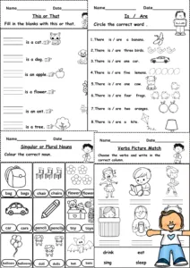 - Is / Are: Correct usage of ‘is’ and ‘are’ in sentences based on singular and plural nouns.