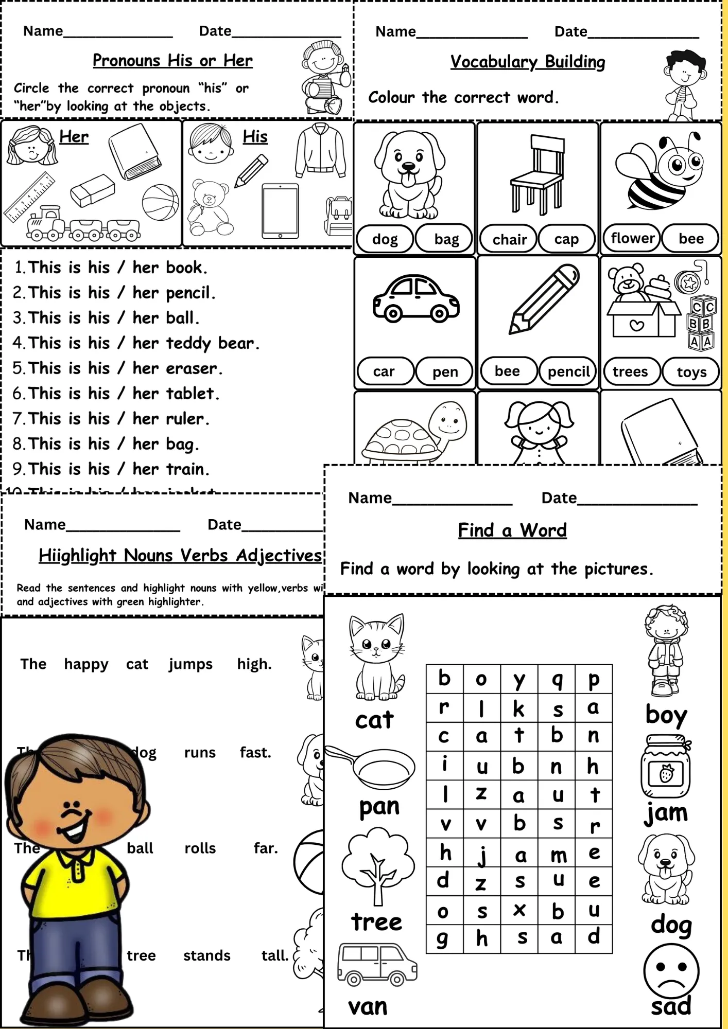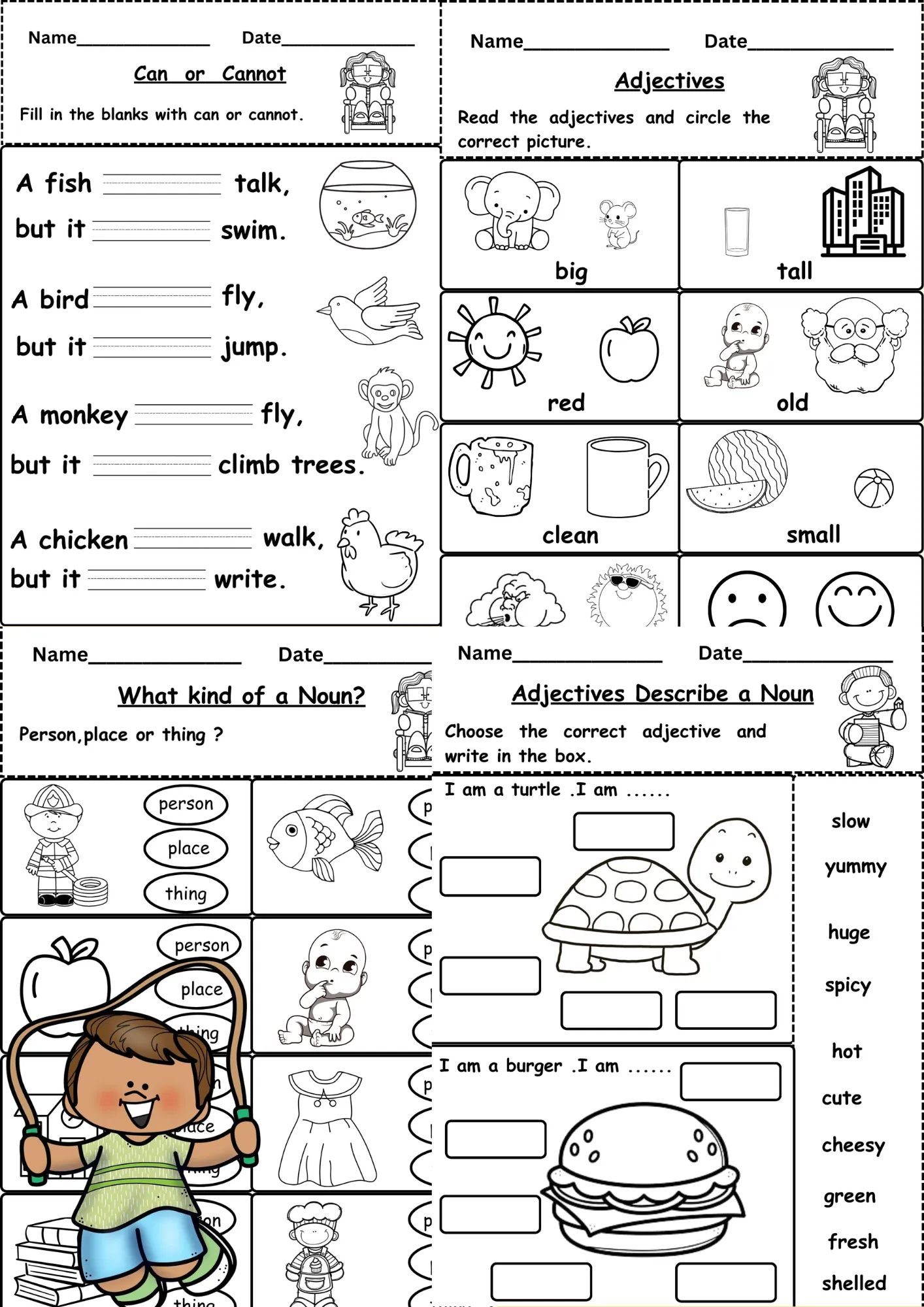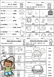 - Adjectives: Identifying and using adjectives to describe nouns, enhancing descriptive skills.