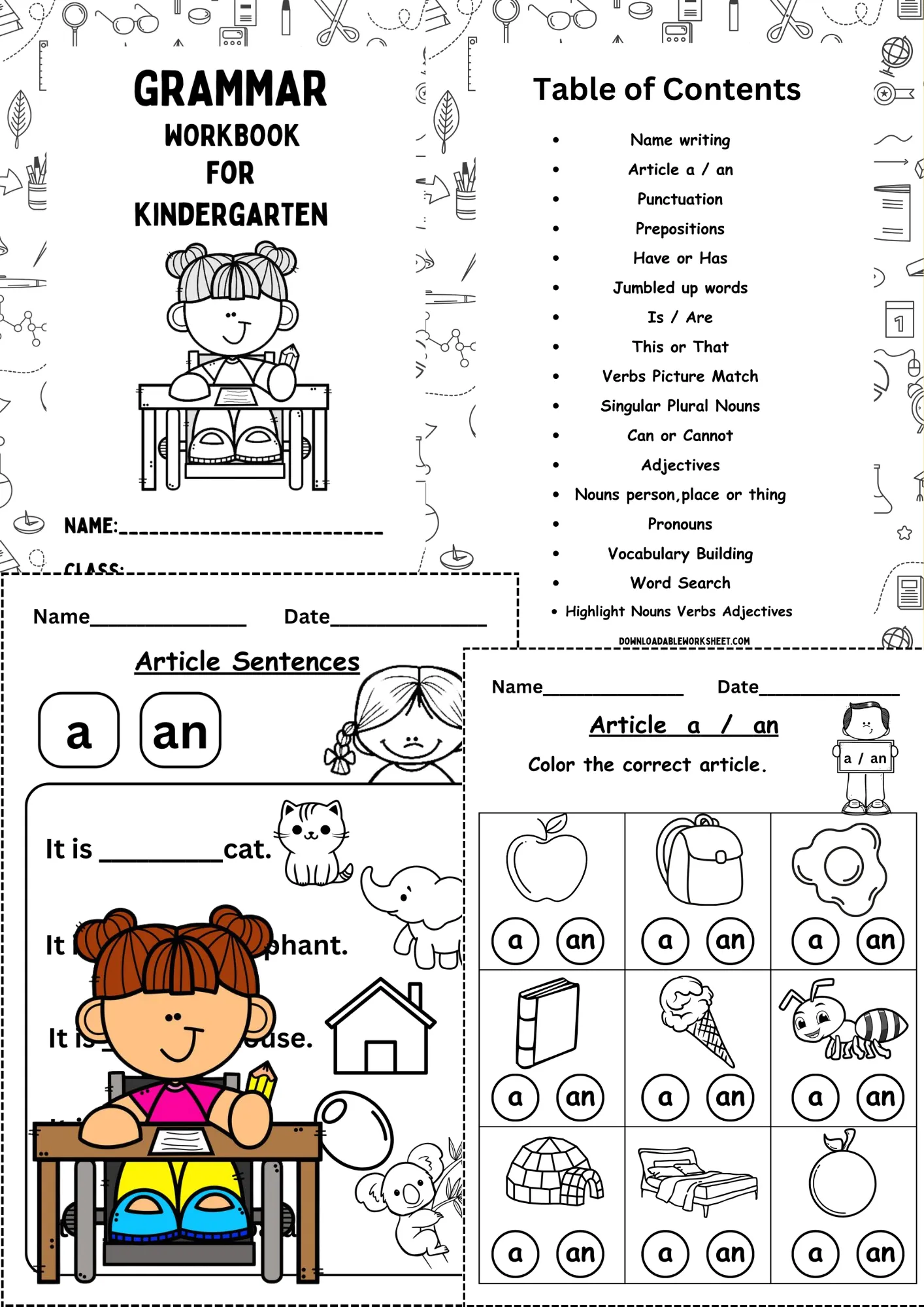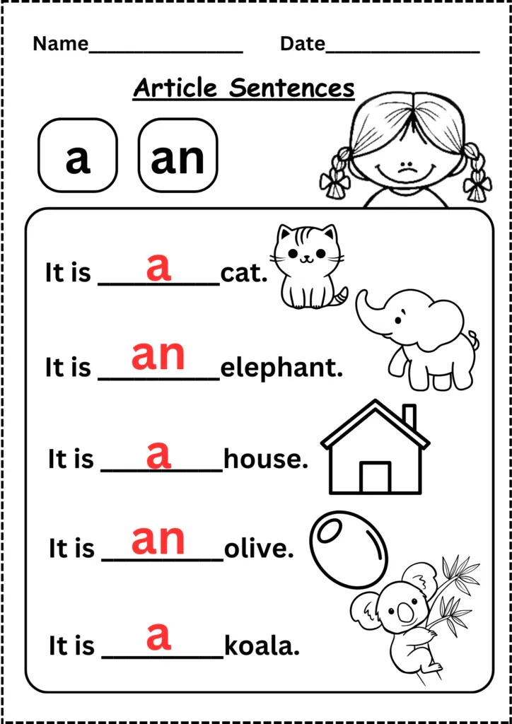 - Article a / an: Understanding the use of ‘a’ and ‘an’ with nouns to form correct sentences.