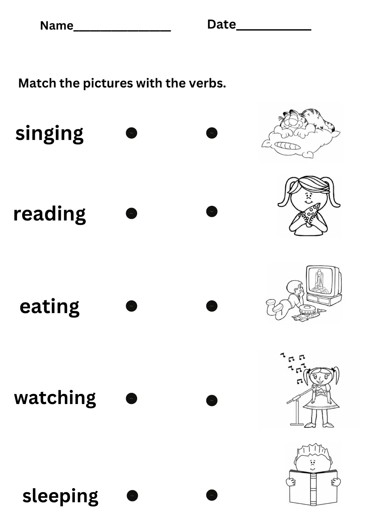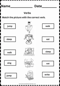 Matching exercises: Matching exercises involve pairing verbs with corresponding images or definitions. This activity enhances children’s ability to associate verbs with their meanings, reinforcing their vocabulary and comprehension.
